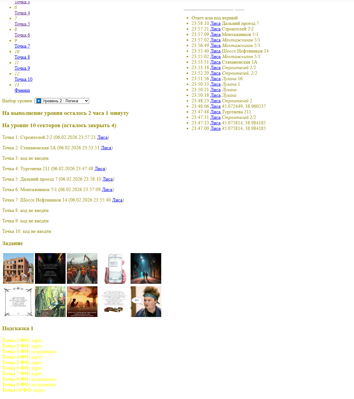 Во-вторых, коды. В игре нужно было вводить загаданные адреса, иначе игру не закрыть. Обычно адреса и координаты записываются в привычном формате, как в Яндекс.Картах, 2ГИС или Google Картах. Здесь же приходилось угадывать, как именно автор занёс их в движок. Это отнимало время и создавало лишние трудности. Но снова - условия одинаковые для всех.